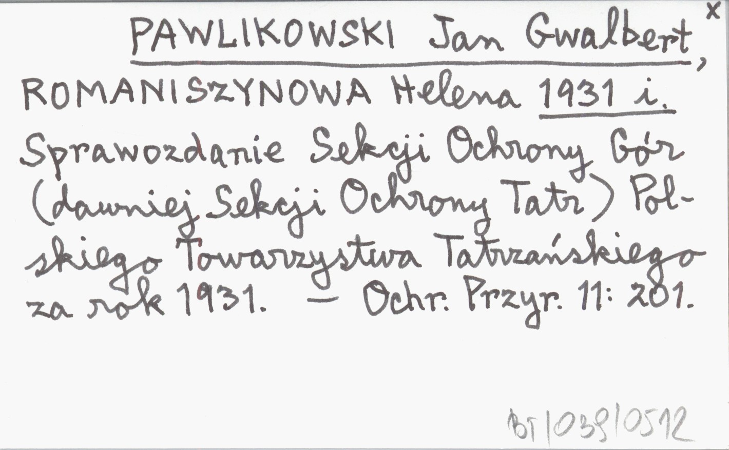PAWLIKOWSKI Jan Gwalbert ROMANISZYNOWA, Helena. ; 1931 i Sprawozdanie Sekcji Ochrony Gór (dawniej Sekcji Ochrony Tatr) Polskiego Towarzystwa Tatrzańskiego za rok 1931.