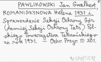 PAWLIKOWSKI Jan Gwalbert ROMANISZYNOWA, Helena. ; 1931 i Sprawozdanie Sekcji Ochrony Gór (dawniej Sekcji Ochrony Tatr) Polskiego Towarzystwa Tatrzańskiego za rok 1931.