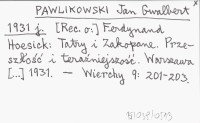 PAWLIKOWSKI Jan Gwalbert 1931 j [Rec. o:] Ferdynand Hoesick: Tatry i Zakopane. Przeszłość i teraźniejszość. Warszawa [...] 1931.