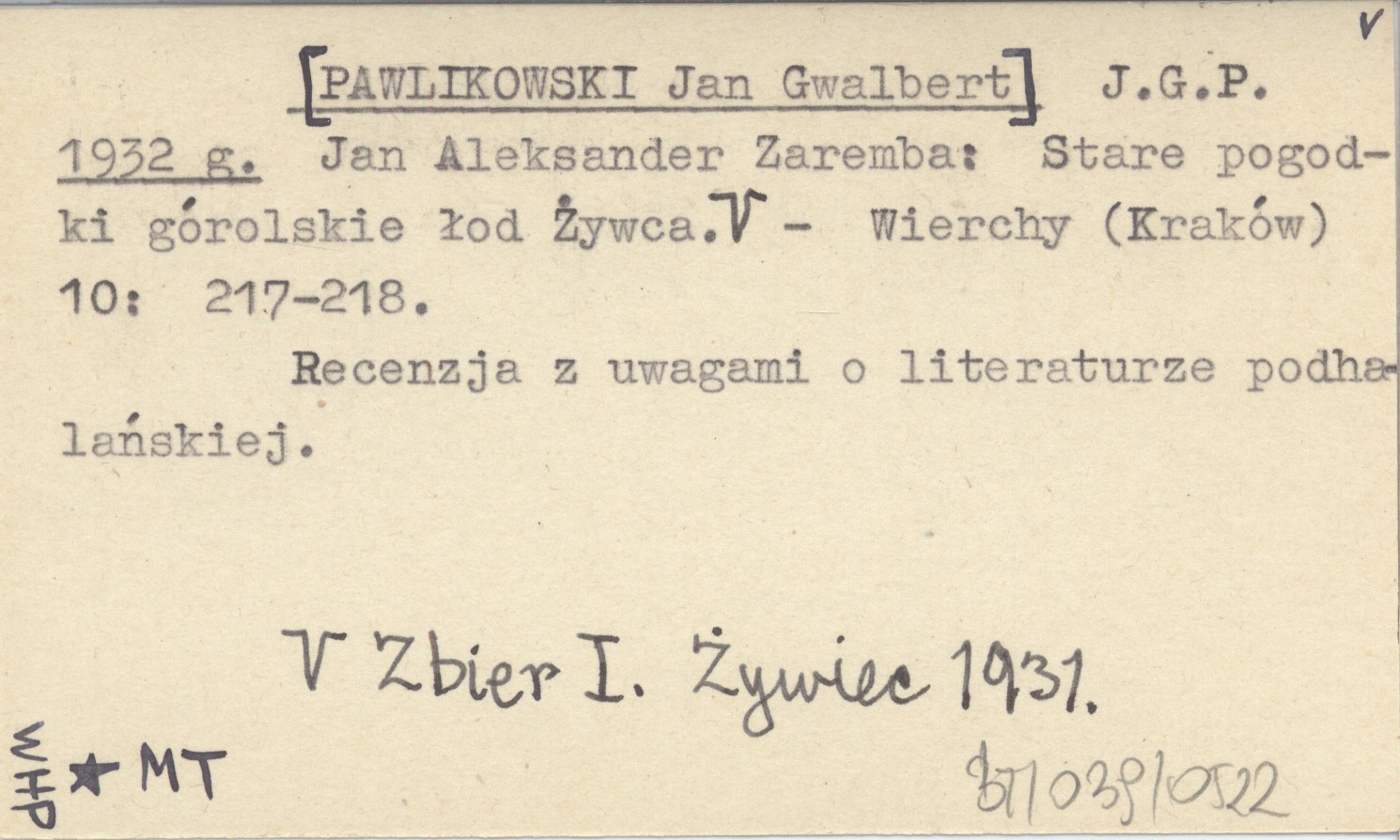 J. G. P. [PAWLIKOWSKI Jan Gwalbert] 1932 g Jan Aleksander Zaremba: Stare pogodki górolskie łod Żywca. Zbier I. Żywiec 1931.