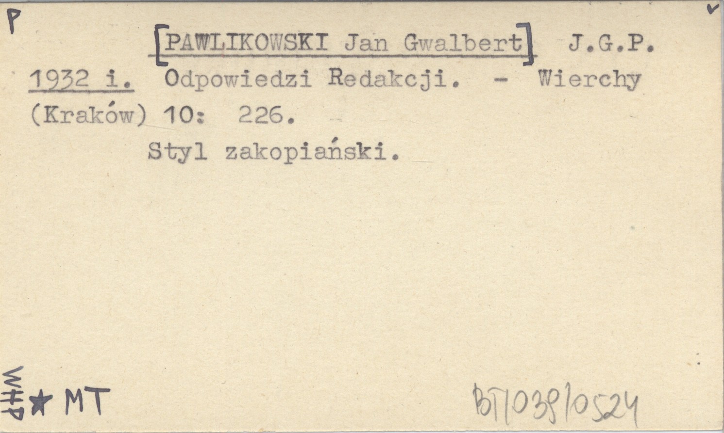 J. G. P. [PAWLIKOWSKI Jan Gwalbert] 1932 i Odpowiedzi Redakcji.