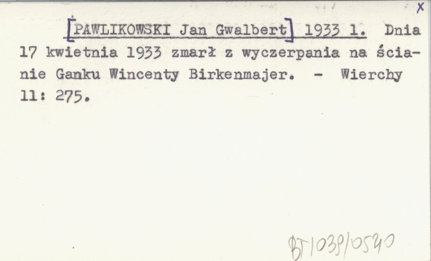 [PAWLIKOWSKI Jan Gwalbert] 1933 l Dnia 17 kwietnia 1933 zmarł z wyczerpania na ścianie Ganku Wincenty Birkenmajer.