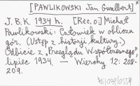 J. B. K. [PAWLIKOWSKI Jan Gwalbert] 1934 h [Rec. o:] Michał Pawlikowski: Człowiek w obliczu gór. (Ustęp z historji kultury). Odbicie z "Przeglądu Współczesnego", lipiec 1934.