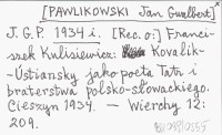 J. G. P. [PAWLIKOWSKI Jan Gwalbert] 1934 i [Rec. o:] Franciszek Kulisiewicz: Kovalik-Ústiansky jako poeta Tatr i braterstwa polsko-słowackiego. Cieszyn 1934.
