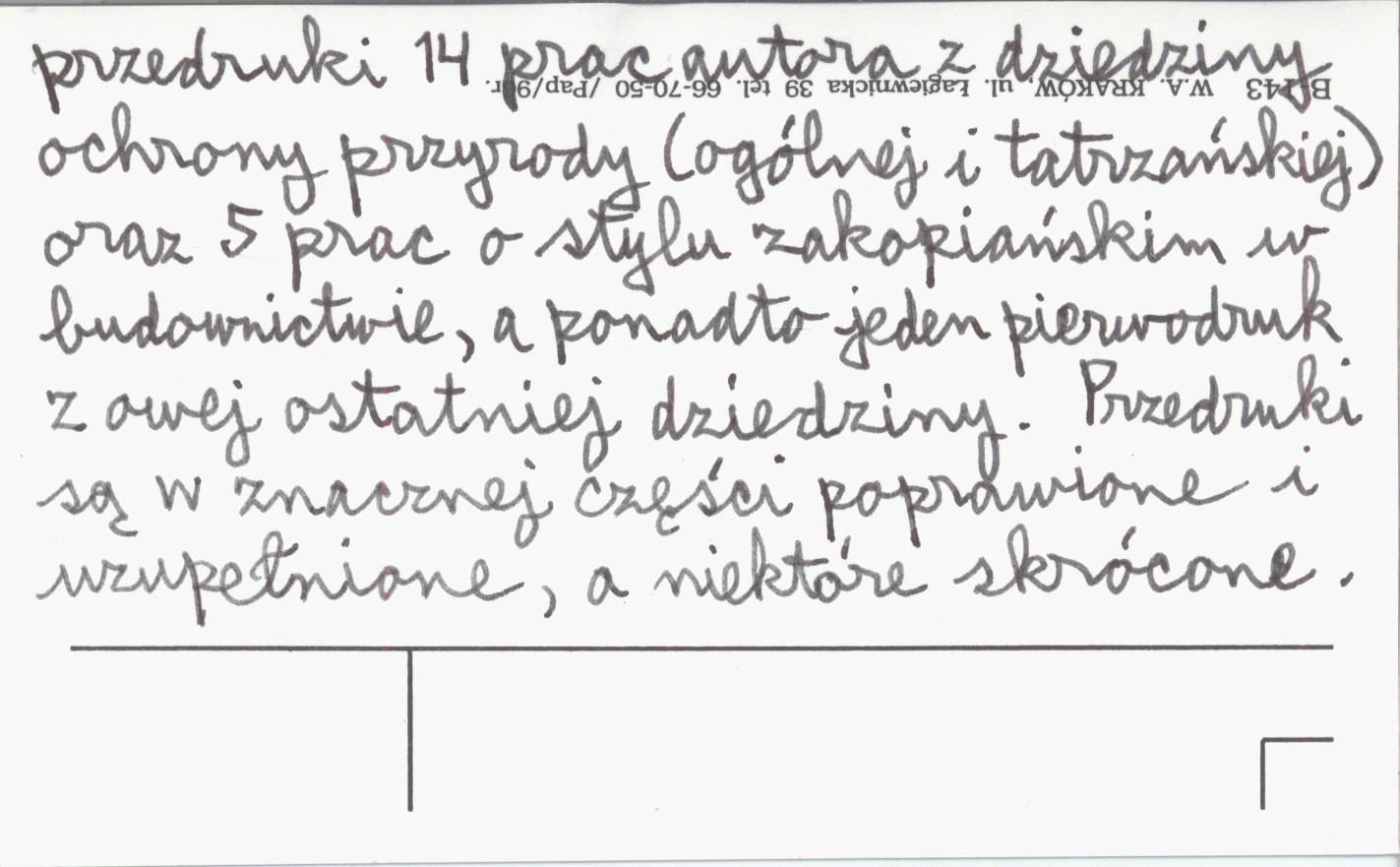 PROP, Warszawa , XVI, 399 s., il., 21 k., okł., 24x17 cm. Po wstępie od redakcji (Adam Wodziczko i Władysław Szafer) i po drugim od autora, książka zawiera przedruki 14 prac autora z dziedziny ochrony przyrody (ogólnej i tatrzańskiej) oraz 5 prac o stylu zakopiańskim w budownictwie, a ponadto jeden pierwodruk z owej ostatniej dziedziny. Przedruki są w znacznej części poprawione i uzupełnione, a niektóre skrócone. REC: A. W., Kwartalnik Biuletynu Informacyjnego, 8, r. 1938, nr 4: 27-28 ; KORCZYŃSKA M. E., Biologia a Życie (Poznań) 1, r. 1939: 48-50 ; MILESKI W., Wierchy 16, r. 1938: 217-218 ; PASSENDORFER E., Wszechświat r. 1938: 253-254 ; Orli Lot (Kraków) 20 (1939), nr 5: 74 ; kr. 1938 ; W walce 1938 ; A. J. M., Warszawski Dziennik Narodowy nr 355 (1938) ; KLECZYŃSKI J. 1938 ; MILESKI Witold, Polska Zachodnia (Katowice) 6 III 1939 ; Wiadomości Turystyczne (Warszawa) 15 I 1939 ; Kurjer Łódzki nr 330 (1938) ; HRYNIEWICKI B. 1939 ; Ziemia (Warszawa) 29 (1939), nr 2: 73 ; KRYGOWSKI W. 1939 c ; WASILEWSKI Z. 1938, 1939, 1939 b, 1939 c, 1939... ; GRABOWSKI T. 1938 ; SZAFER W. 1939 b ; MILESKI W. 1939 c ; WASYLEWSKI S. 1939 ; ZAJĄCZKOWSKI M. 1939 a ;
