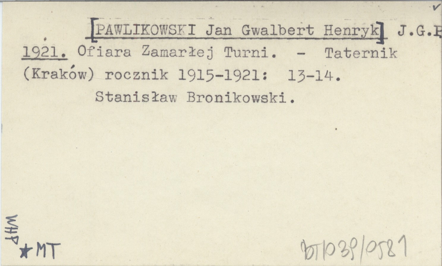 J. G. H. [PAWLIKOWSKI Jan Gwalbert Henryk] 1921 Ofiara Zamarłej Turni.