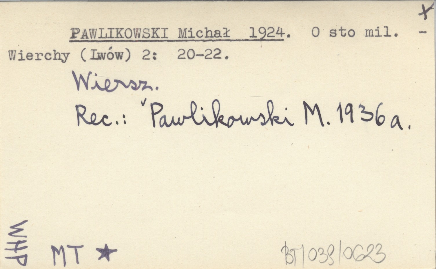 Wierchy (Lwów) , 2: 20-22. Wiersz. REC: PAWLIKOWSKI M. 1936 a ; MANTEL F. 1971 ; BIELECKI T. 1971 ;