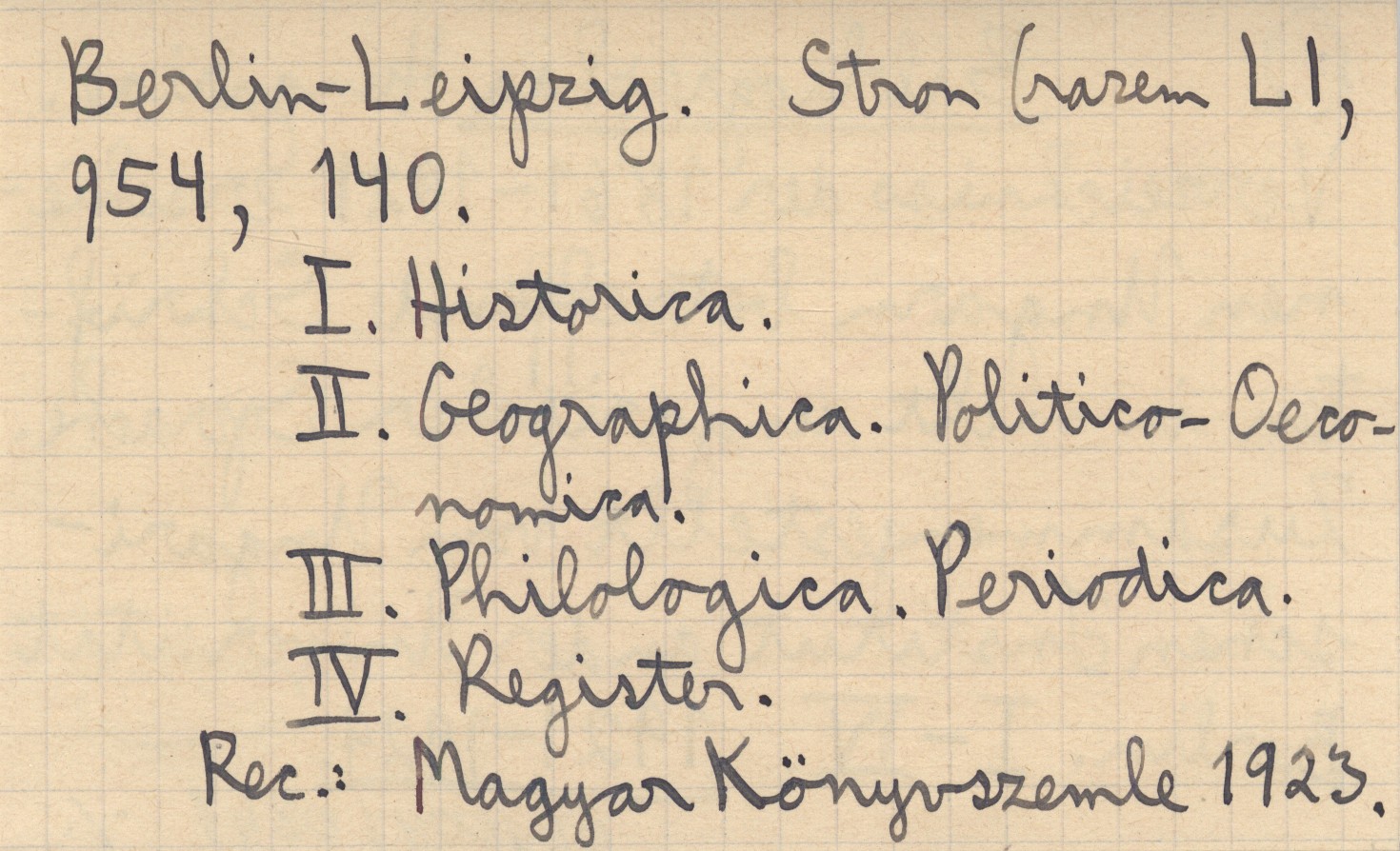Berlin ; Leipzig ; , LI, 954, 140 s. I. Historica. II. Geographica. Politico-Oeconomica. III. Philologica. Periodica. IV. Register. REC: Magyar KÖNYVSZEMLE 1923