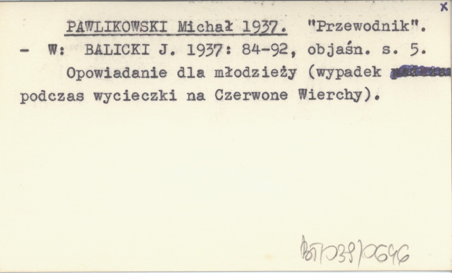 BALICKI J. 1937 , S. 84-92. Opowiadanie dla młodzieży (wypadek podczas wycieczki na Czerwone Wierchy). Objaśn. na s. 5.