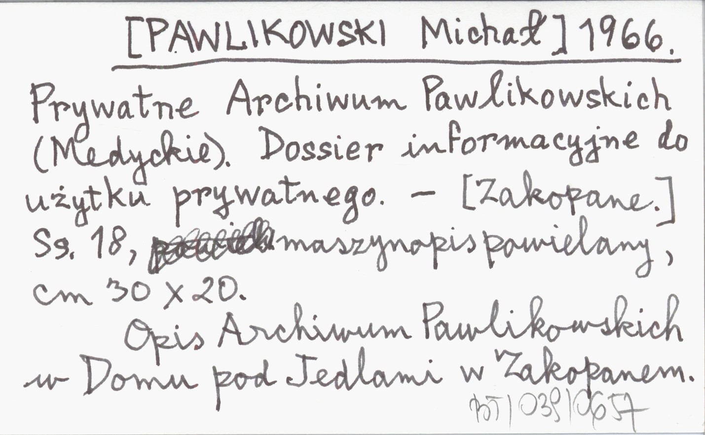[PAWLIKOWSKI Michał] 1966 Prywatne Archiwum Pawlikowskich (Medyckie). Dossier informacyjne do użytku prywatnego.