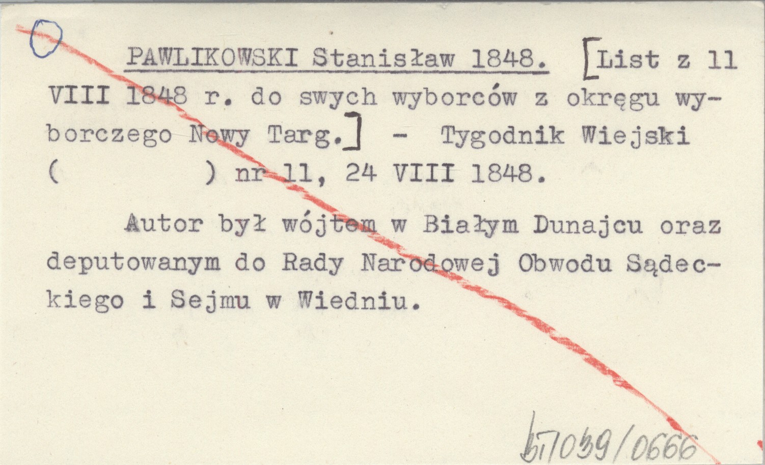Tygodnik Wiejski, Nr 11 (24 VIII 1848). Autor był wójtem w Białym Dunajcu oraz deputowanym do Rady Narodowej Obwodu Sądeckiego i Sejmu w Wiedniu.