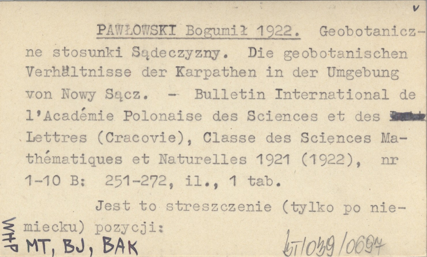 PAWŁOWSKI Bogumił 1922 Geobotaniczne stosunki Sądeczyzny. Die geobotanischen Verhältnisse der Karpathen in der Umgebung von Nowy Sącz.