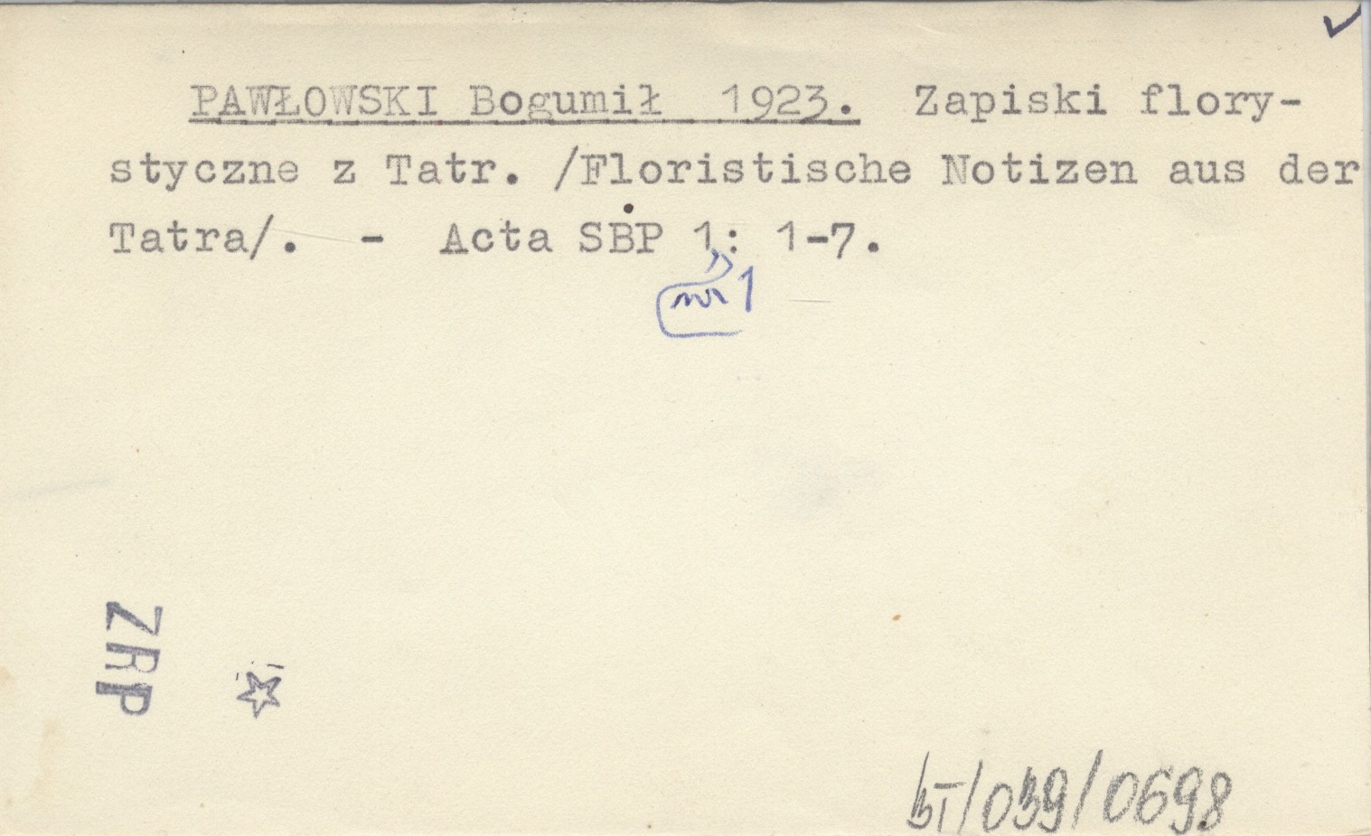 PAWŁOWSKI Bogumił 1923 Zapiski florystyczne z Tatr. (Floristische Notizen aus der Tatra).