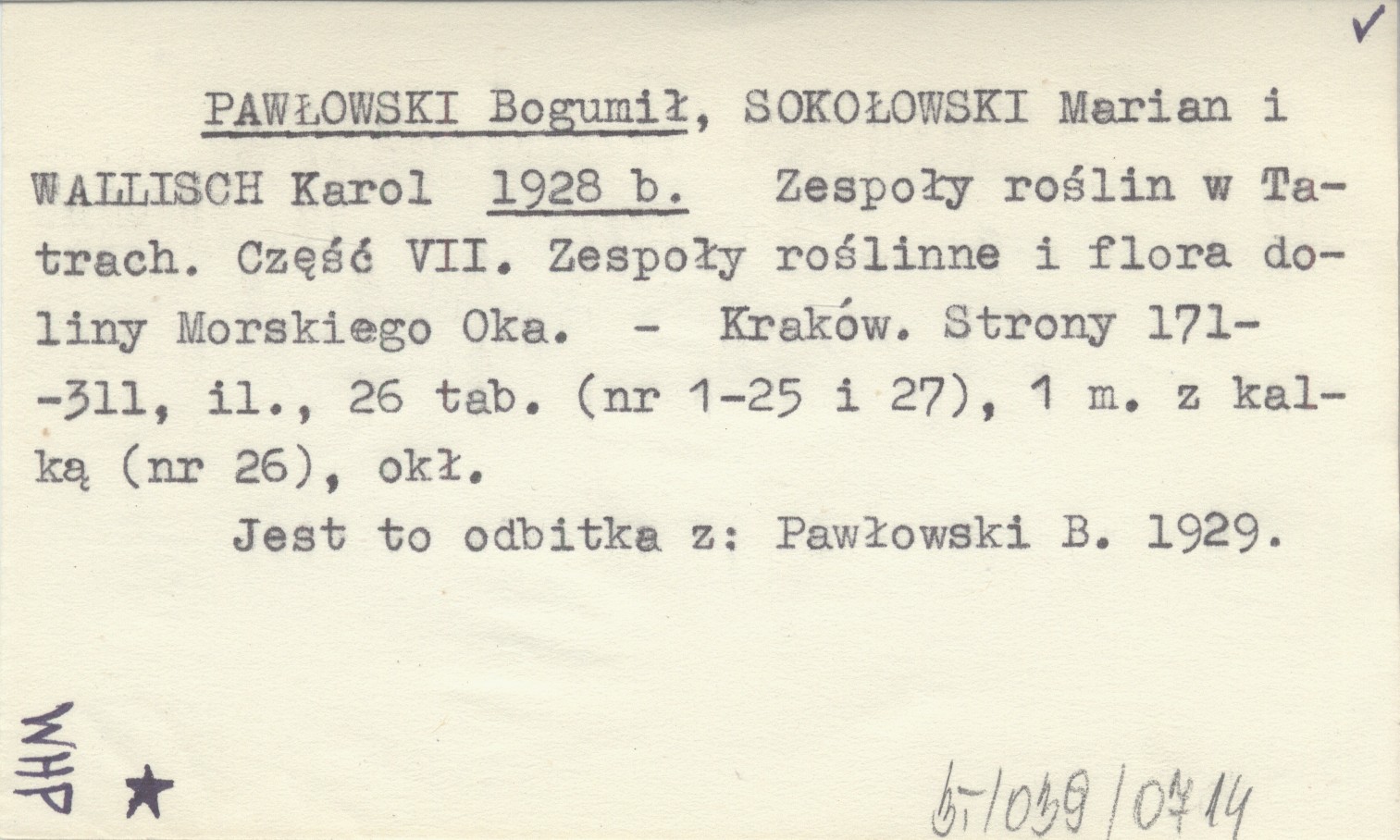 PAWŁOWSKI Bogumił SOKOŁOWSKI, Marian. ; WALLISCH, Karol. ; 1928 b Zespoły roślin w Tatrach. Część VII. Zespoły roślinne i flora doliny Morskiego Oka.
