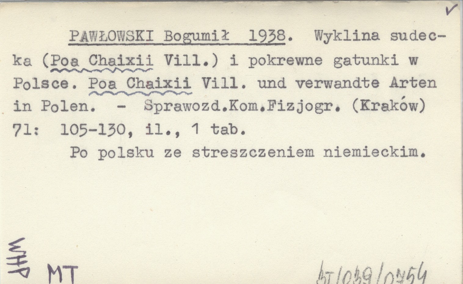 PAWŁOWSKI Bogumił 1938 Wyklina sudecka (Poa Chaixii Vill.) i pokrewne gatunki w Polsce. Poa Chaixii Vill. und verwandte Arten in Polen.