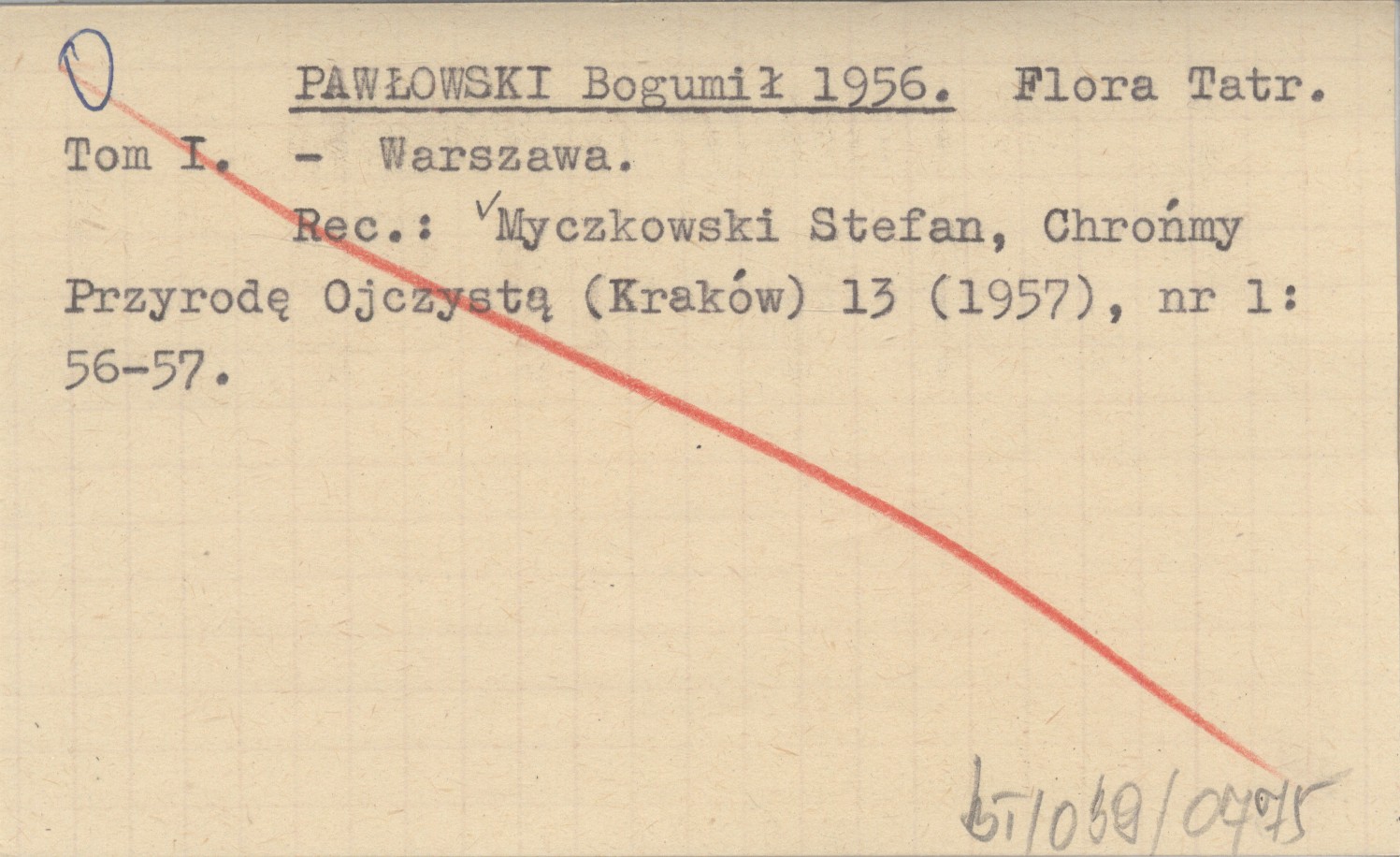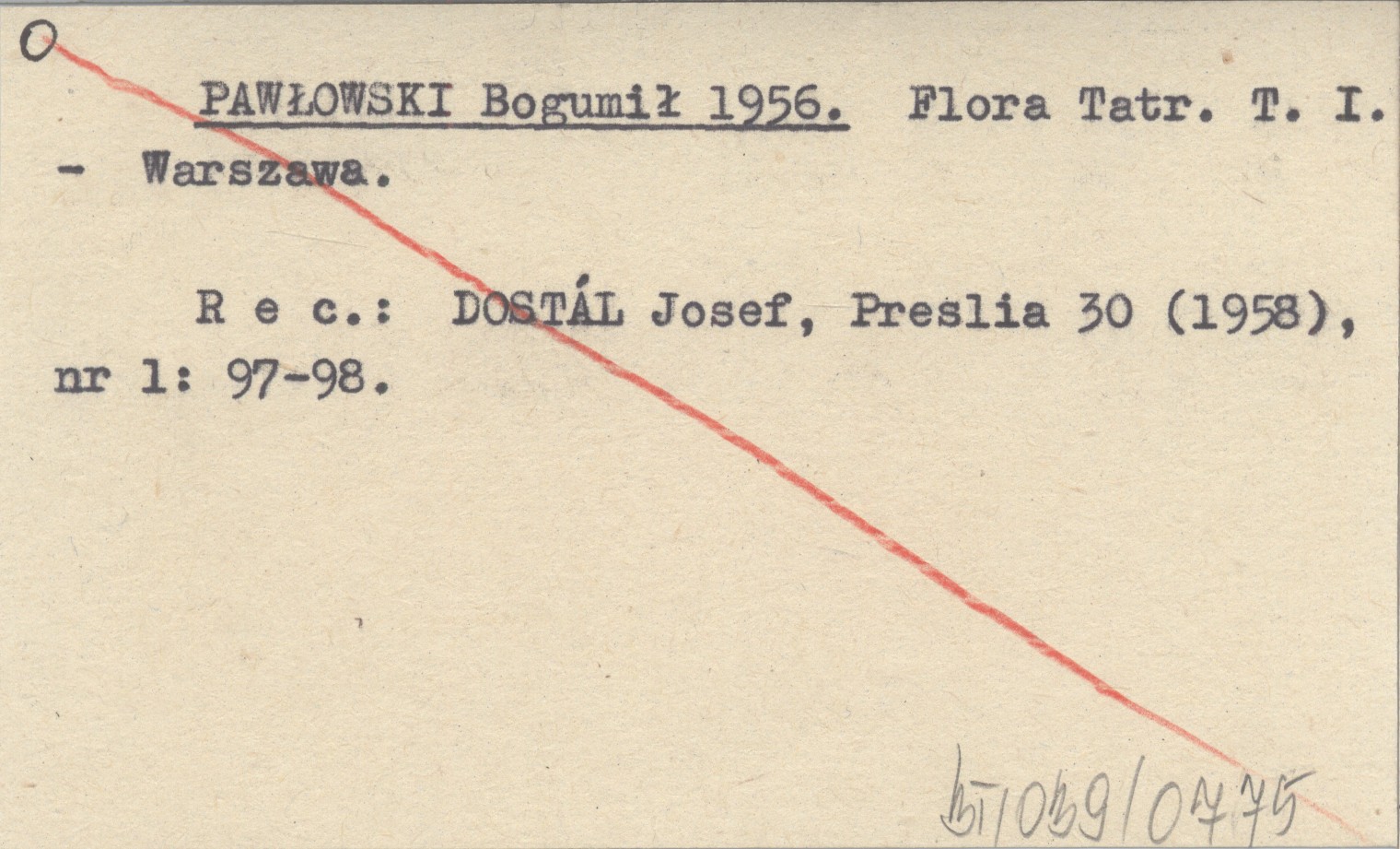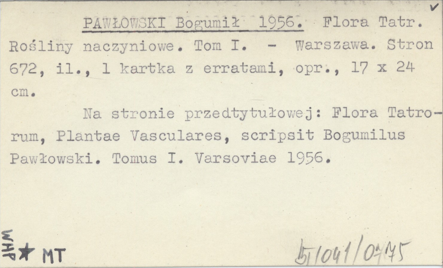 Warszawa , 672 s., il., err., opr., 17x24 cm. Na stronie przedtytułowej: Flora Tatrorum, Plantae Vasculares, scripsit Bogumilus Pawłowski. Tomus I. Varsoviae 1956. REC: DOSTÁL Josef, Preslia 30 (1958) nr 1: 97-98 ; MYCZKOWSKI Stefan, Chrońmy Przyrodę Ojczystą (Kraków) 13 (1957), nr 1: 56-57 ;