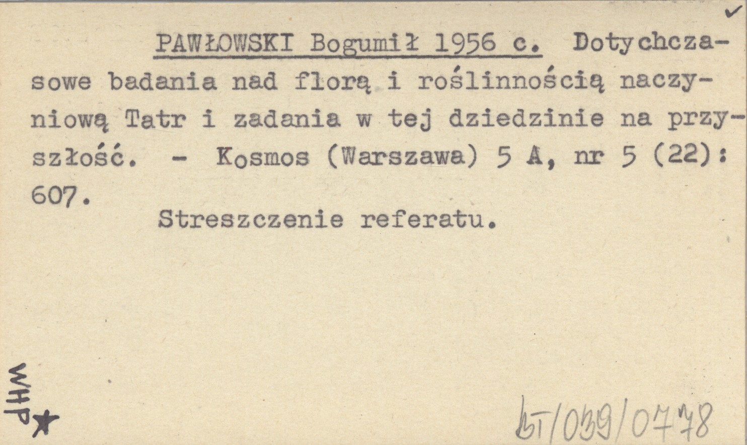 PAWŁOWSKI Bogumił 1956 c Dotychczasowe badania nad florą i roślinnością naczyniową Tatr i zadania w tej dziedzinie na przyszłość.