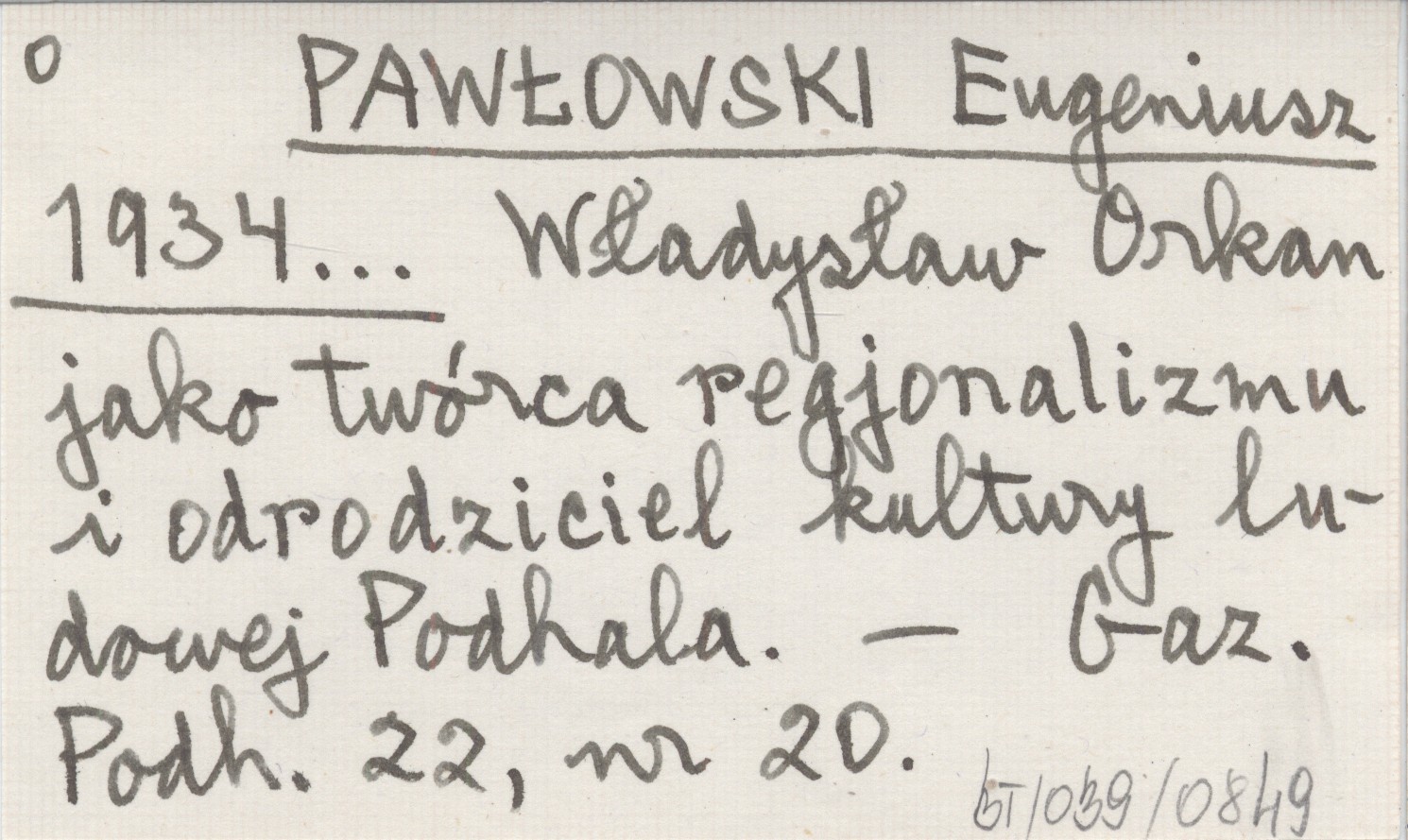 PAWŁOWSKI Eugeniusz 1934... Władysław Orkan jako twórca regjonalizmu i odrodziciel kultury ludowej Podhala.