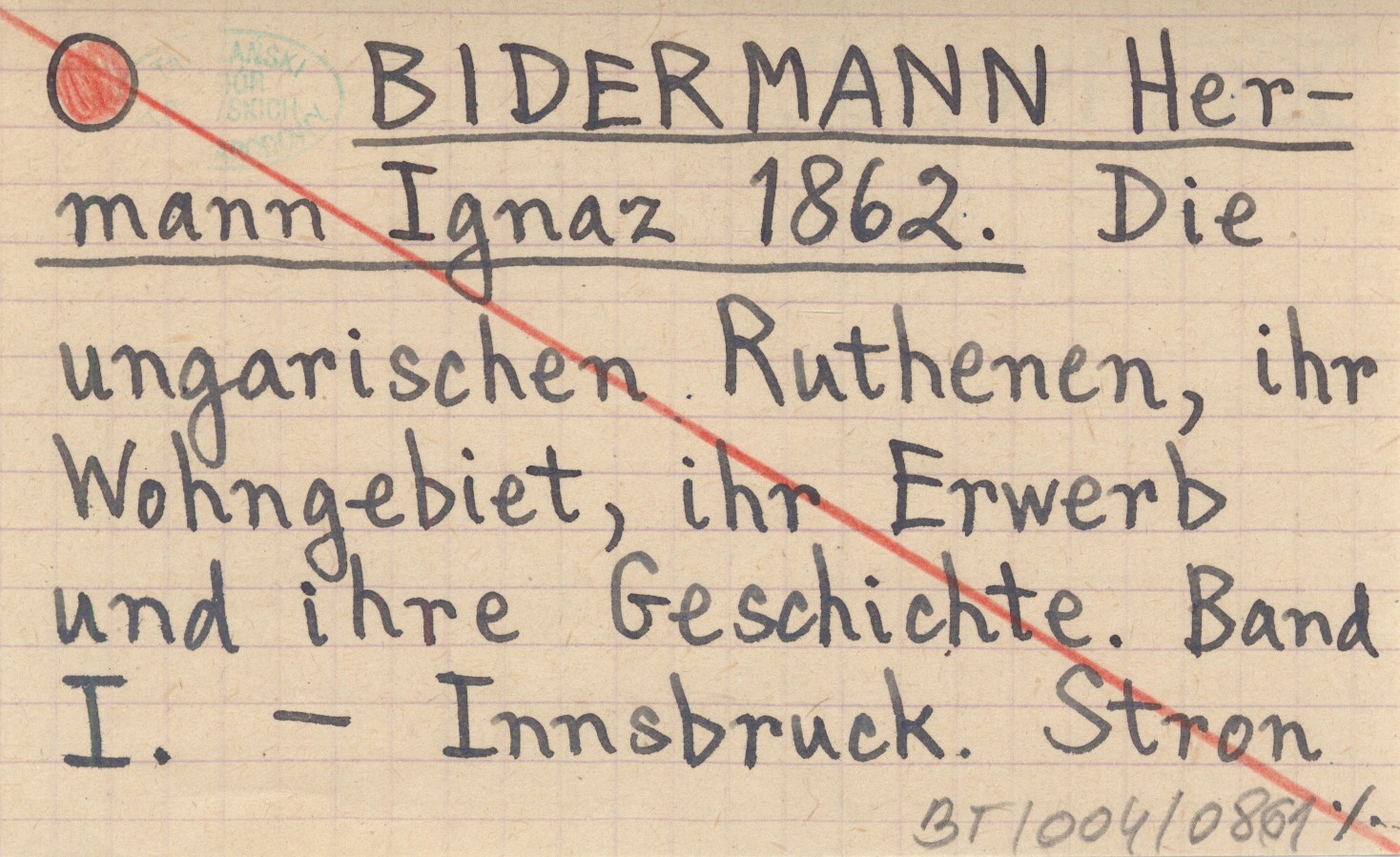 BIDERMANN Hermann Ignaz 1862 Die ungarischen Ruthenen, ihr Wohngebiet, ihr Erwerb und ihre Geschichte. Band I.