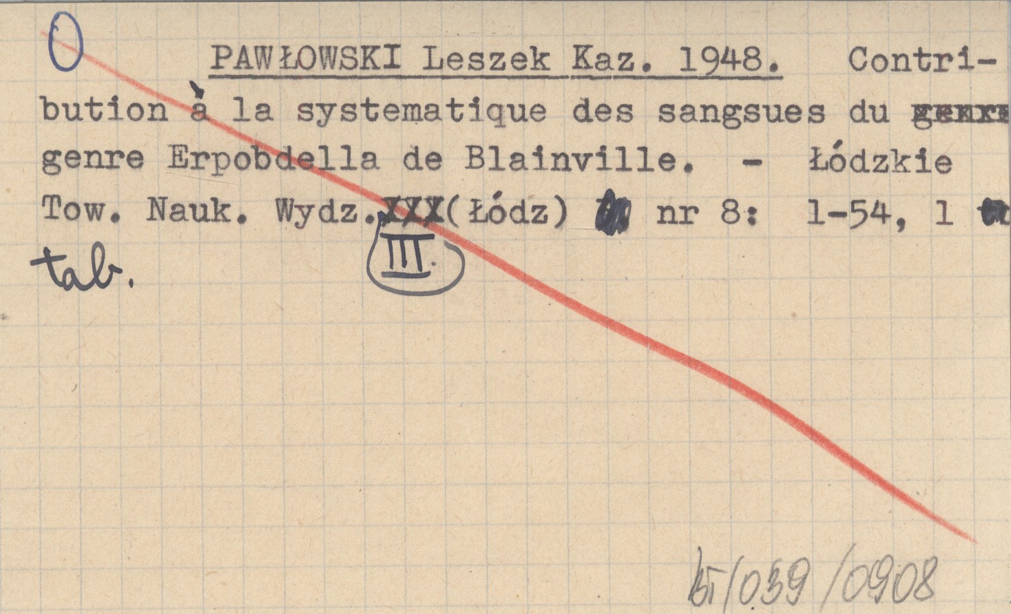 PAWŁOWSKI Leszek Kazimierz 1948 Contribution á la systematique des sangsues du genre Erpobdella de Blainville.