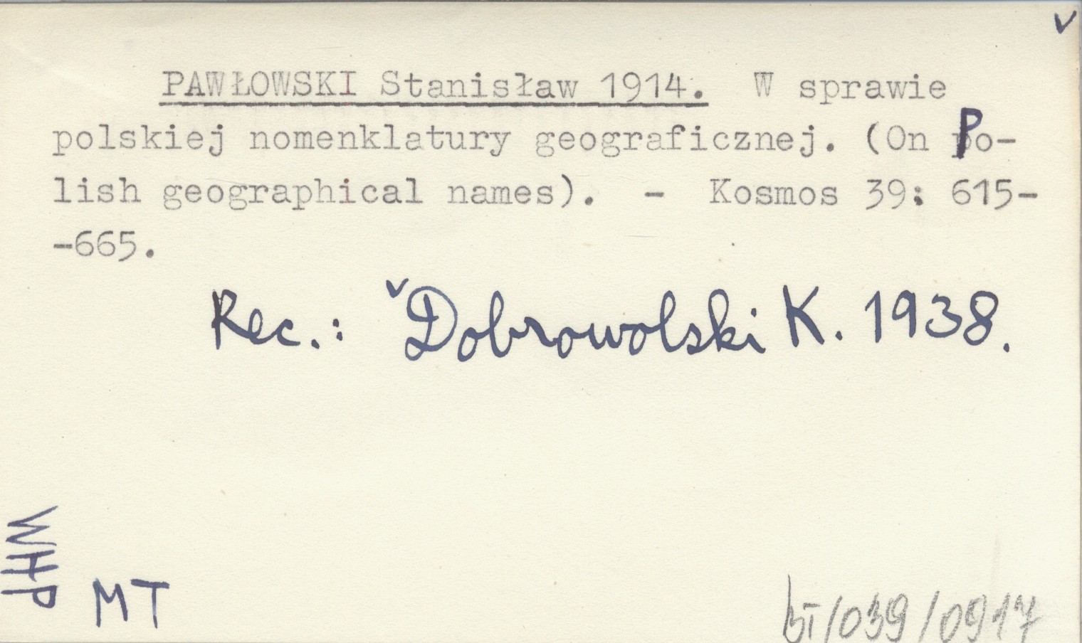 PAWŁOWSKI Stanisław 1914 W sprawie polskiej nomenklatury geograficznej. (On Polish geographical names).