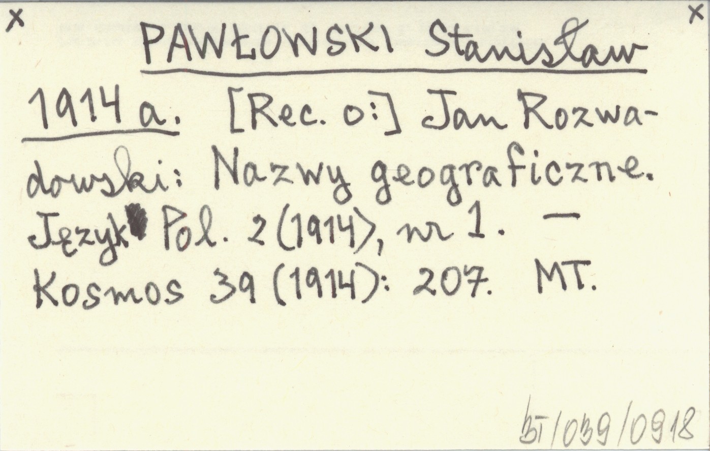PAWŁOWSKI Stanisław 1914 a [Rec o:] Jan Rozwadowski: Nazwy geograficzne. Język Polski 2 (1914), nr 1.