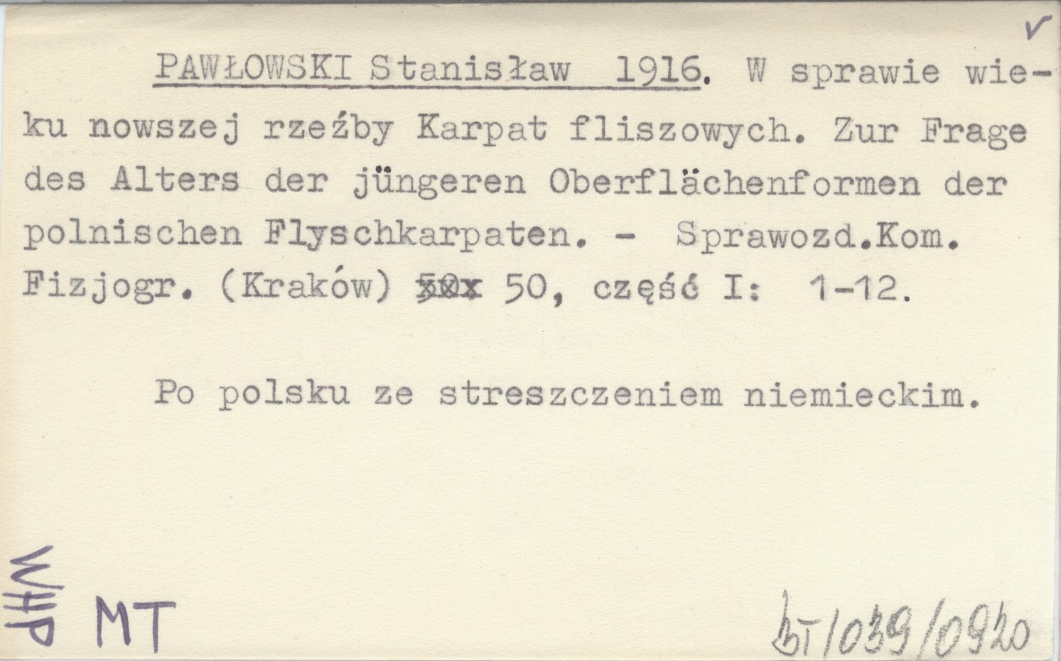 PAWŁOWSKI Stanisław 1916 W sprawie wieku nowszej rzeźby Karpat fliszowych. Zur Frage des Alters der jüngeren Oberflächenformen der polnischen Flyschkarpaten.