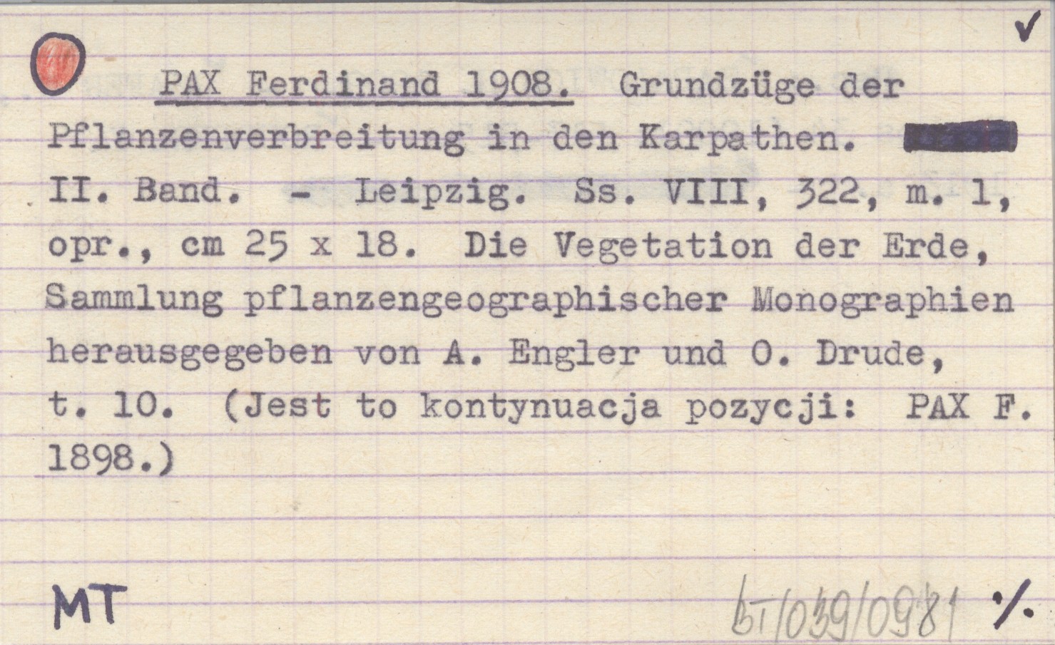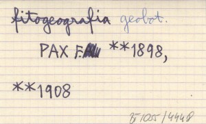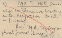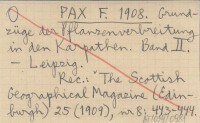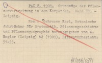 Leipzig , VIII, 322 s., 1 mapa, opr., 25x18 cm. Die Vegetation der Erde, Sammlung pflanzengeographischer Monographien herausgegeben von A. Engler und O. Drude, t. 10. (Jest to kontynuacja pozycji: PAX F. 1898). REC: ZAPAŁOWICZ H. 1909 ; SZAFER W., Kosmos 34 (1909): 513-515 ; ROUPPERT K. 1913 a ; The Scottish Geographical Magazine (Edinburgh) 25 (1909), nr 8: 443-444 ; M. H., The Geographical Journal (London) 34 (1909), nr 2: 195-196 ; GEHRMANN Karl, Botanische Jahrbücher für Systematik, Pflanzengeschichte und Pflanzengeographie herausgegeben von A. Engler (Leipzig) 42 (1909), Literaturbericht: 51-55 ;