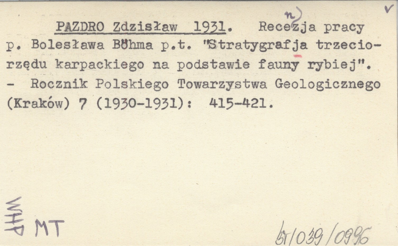 PAZDRO Zdzisław 1931 Recenzja pracy p. Bolesława Böhma p.t. "Stratygrafja trzeciorzędu karpackiego na podstawie fauny rybiej".