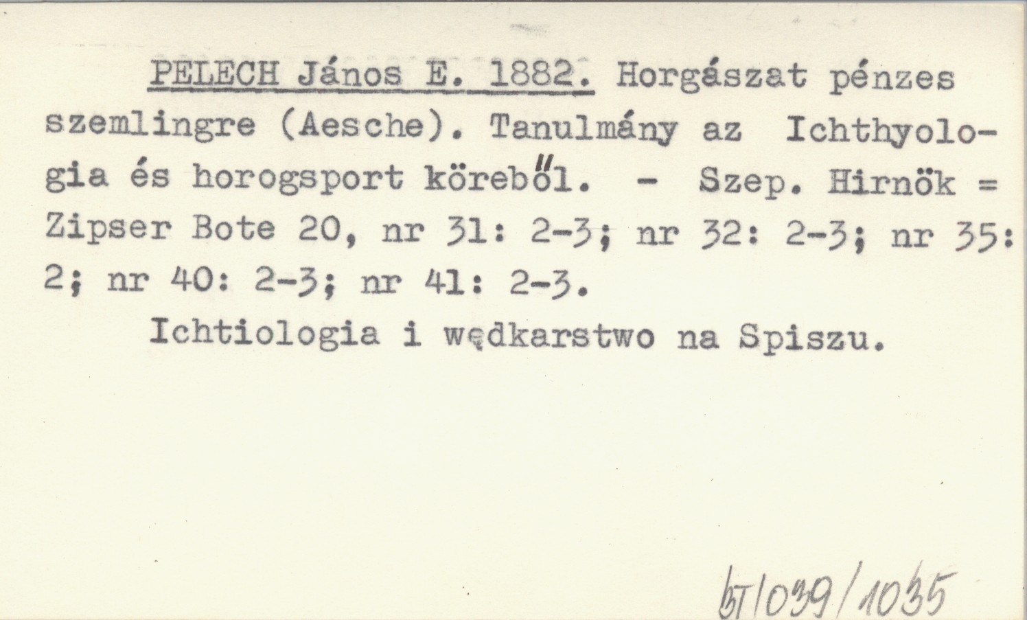 PELECH János E. 1882 Horgászat pénzes szemlingre (Aesche). Tanulmány az Ichthyologia és horogsport köreből.