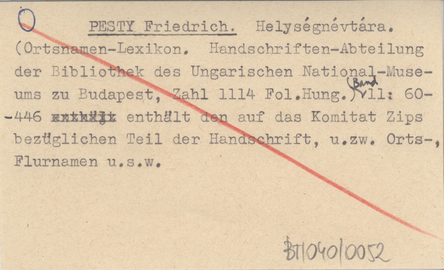 PESTY Friedrich Helységnévtára. (Ortsnamen-Lexikon. Handschriften-Abteilung der Bibliothek des Ungarischen National-Museums zu Budapest, Zahl 1114 Fol. Hung.).