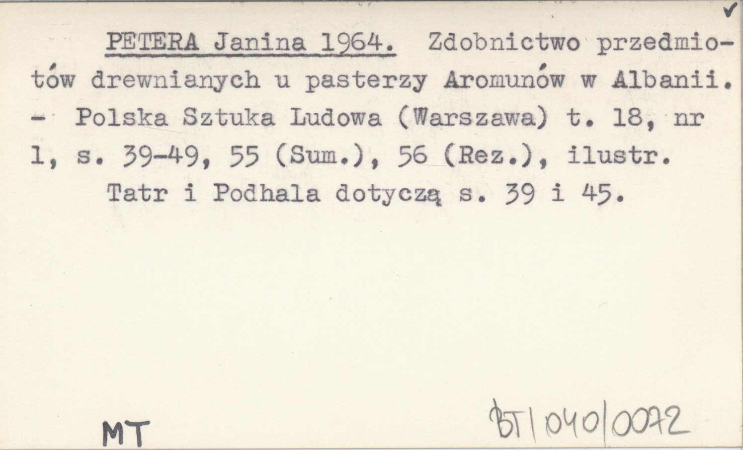 PETERA Janina 1964 Zdobnictwo przedmiotów drewnianych u pasterzy Aromunów w Albanii.