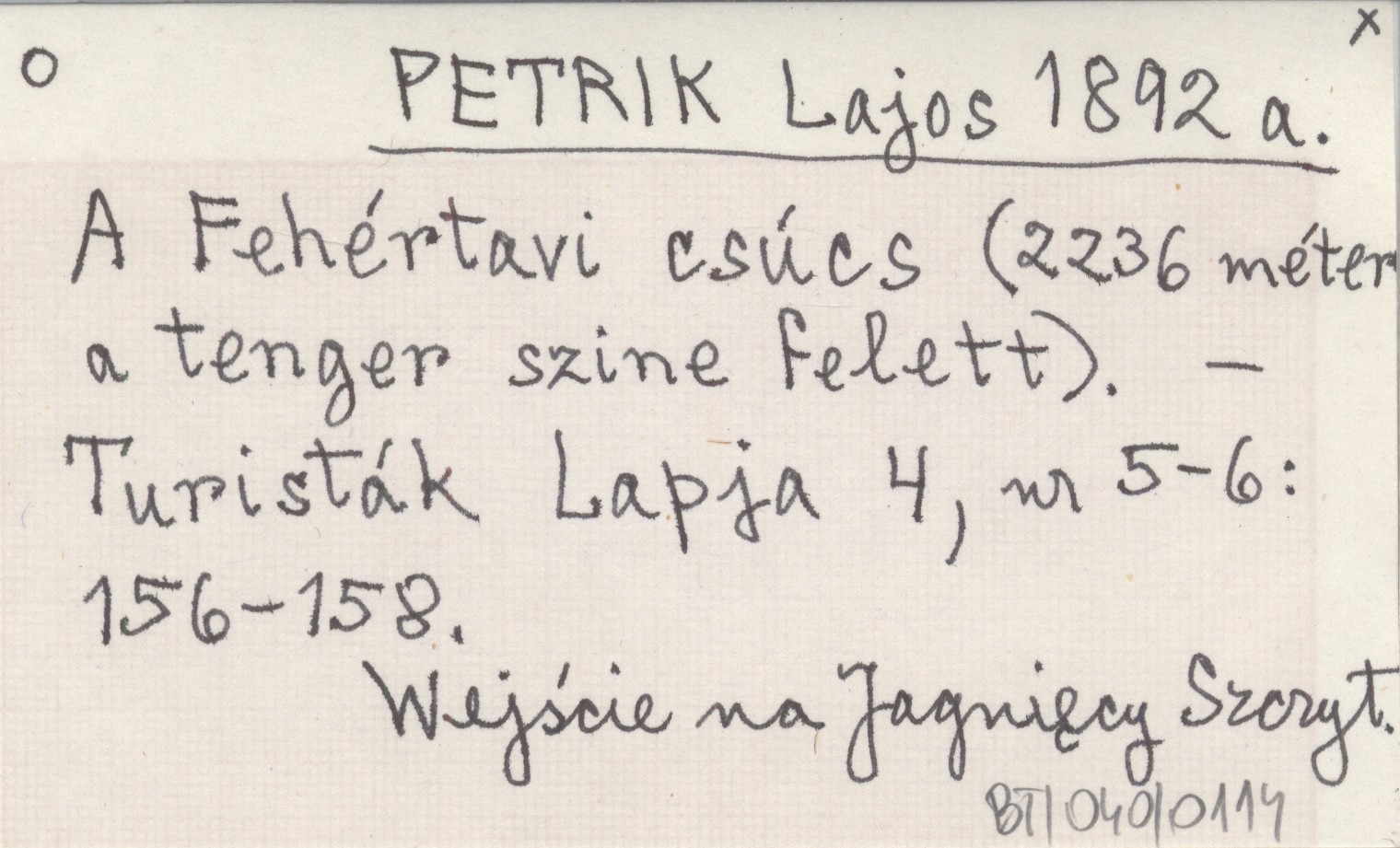 PETRIK Lajos 1892 a A Fehértavi csúcs (2236 méter a tenger szine felett).