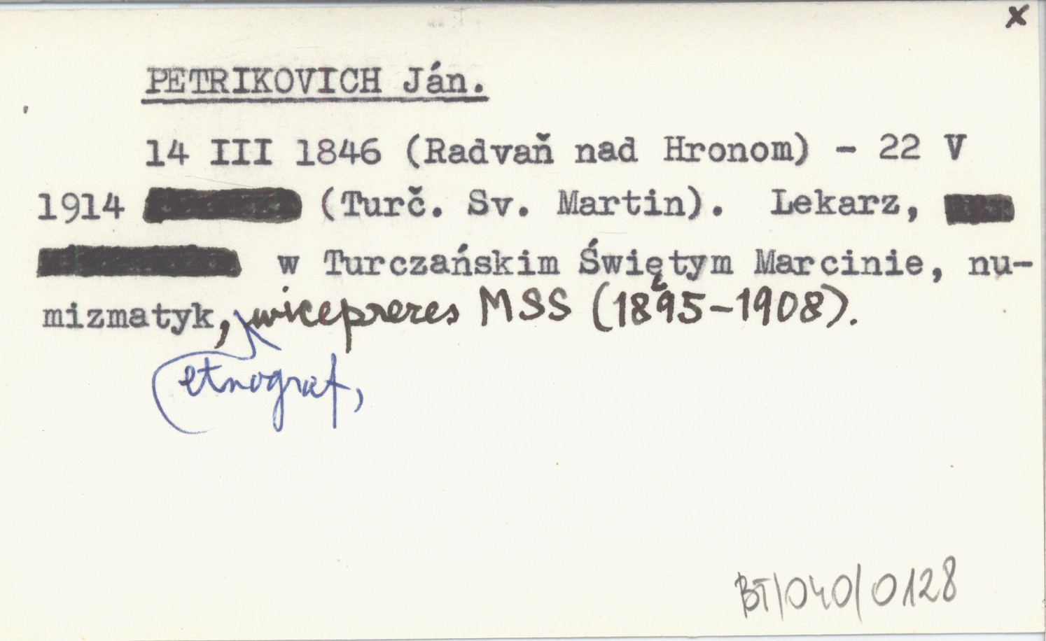 14 III 1846 (Radvaň nad Hronom) - 22 V 1914 (Turčiansky Svätý Martin). Lekarz, w Turczańskim Świętym Marcinie, numizmatyk, etnograf, wiceprezes MSS (1895-1908).