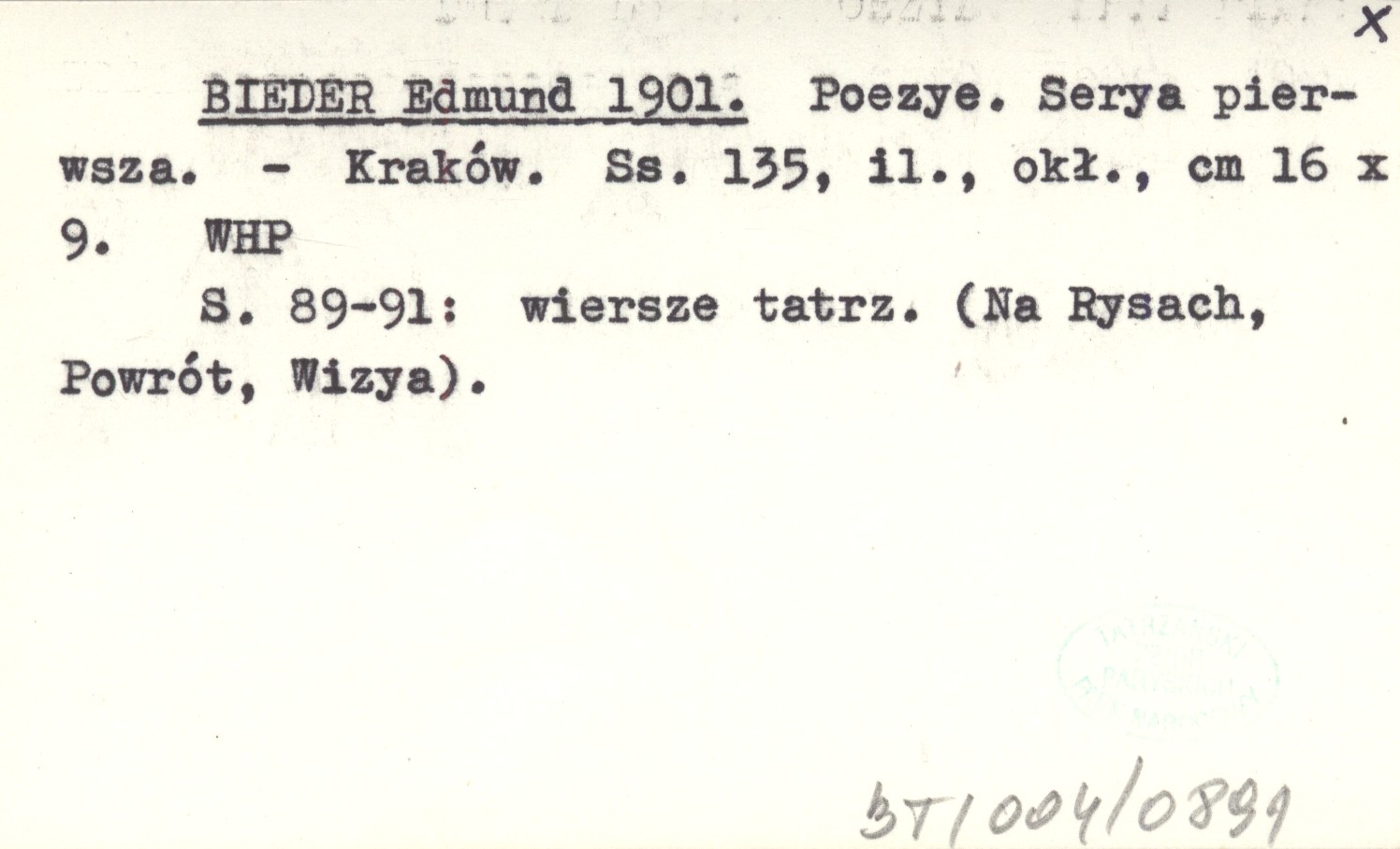 Kraków , 135 s., il., okł., 16x9 cm. S. 89-91: wiersze tatrzańskie (Na Rysach, Powrót, Wizya).