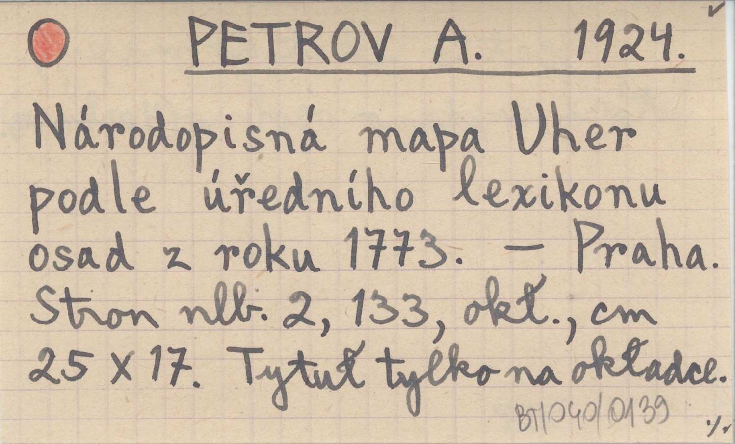 PETROV A. 1924 Národopisná mapa Uher podle úředního lexikonu osad z roku 1773.