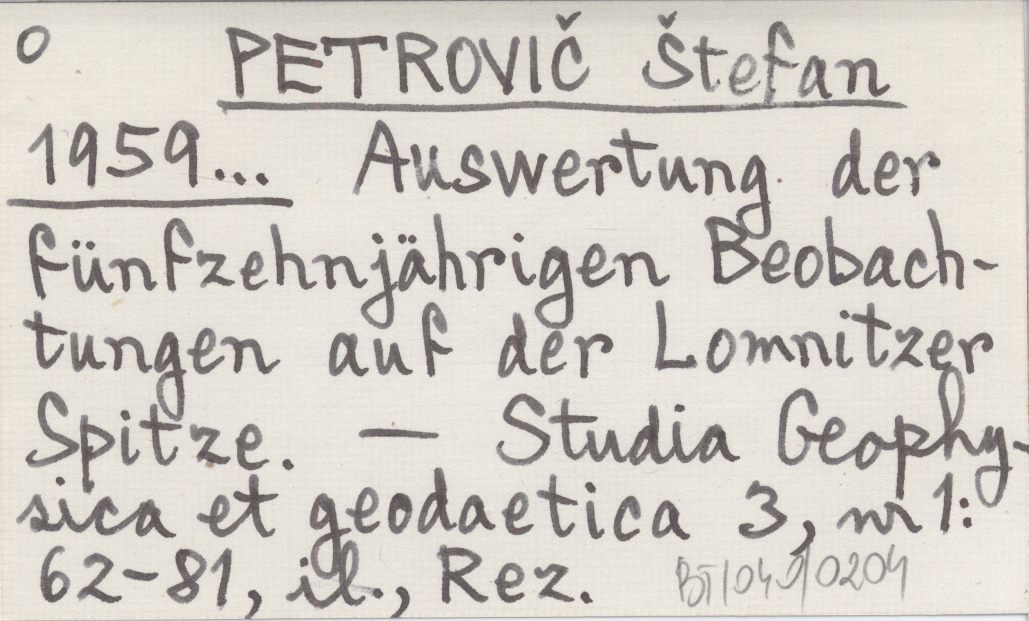 PETROVIČ Štefan 1959... Auswertung der fünfzehnjährigen Beobachtungen auf der Lomnitzer Spitze.