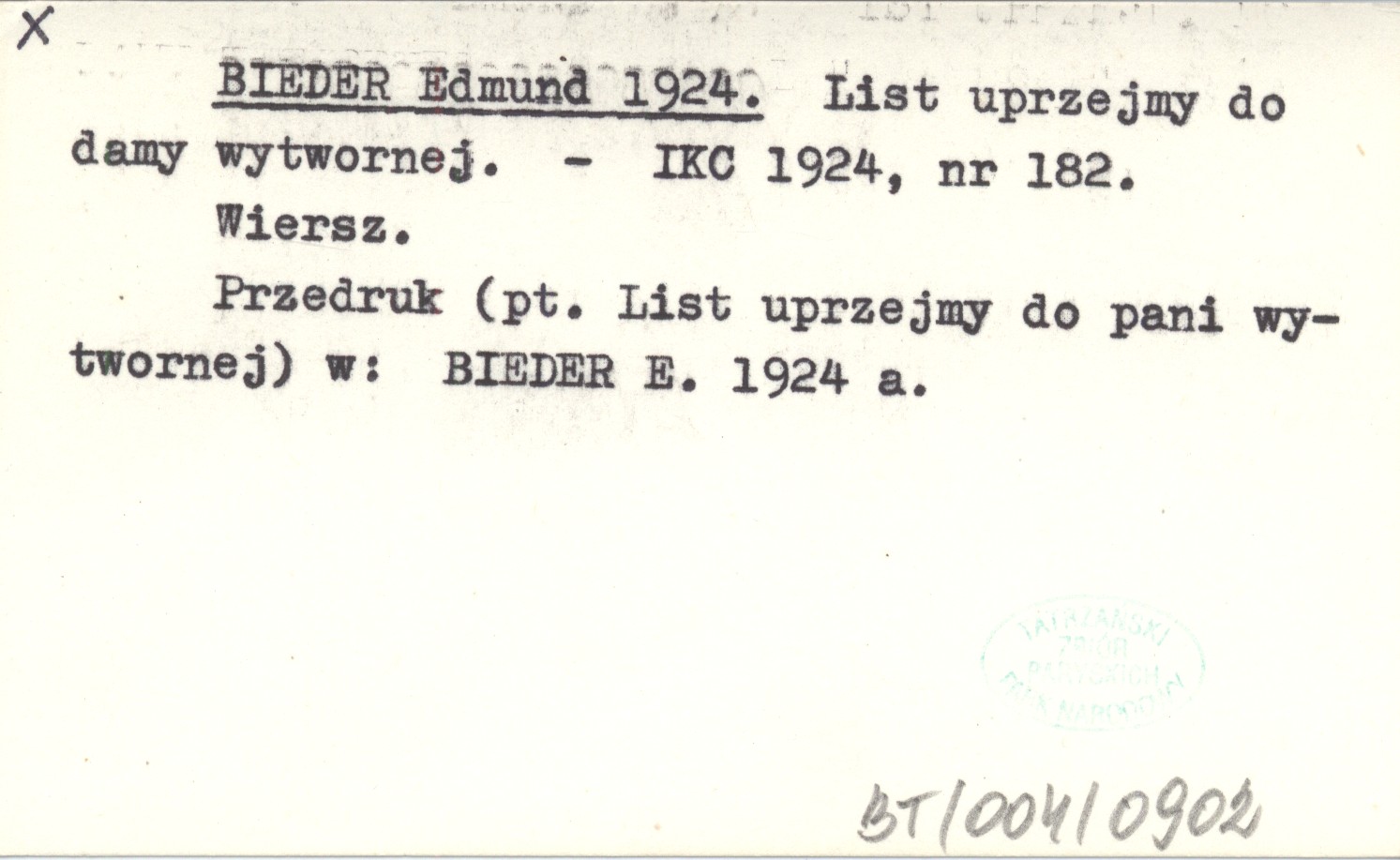 Ilustrowany Kuryer Codzienny, Nr 182. Wiersz. Przedruk (pt. List uprzejmy do pani wytwornej) w: BIEDER E. 1924 a