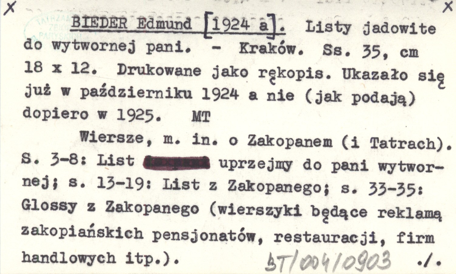 Kraków , 35 s., 18x12 cm. Wiersze, m.in. o Zakopanem (i Tatrach). S. 3-8: List uprzejmy do pani wytwornej; s. 13-19: List z Zakopanego; s. 33-35: Glossy z Zakopanego (wierszyki będące reklamą zakopiańskich pensjonatów, restauracji, firm handlowych itp.). Drukowane jako rękopis. Ukazało się już w październiku 1924 a nie (jak podają) dopiero w 1925. REC: Ilustrowany Kuryer Codzienny r. 1924, nr 314