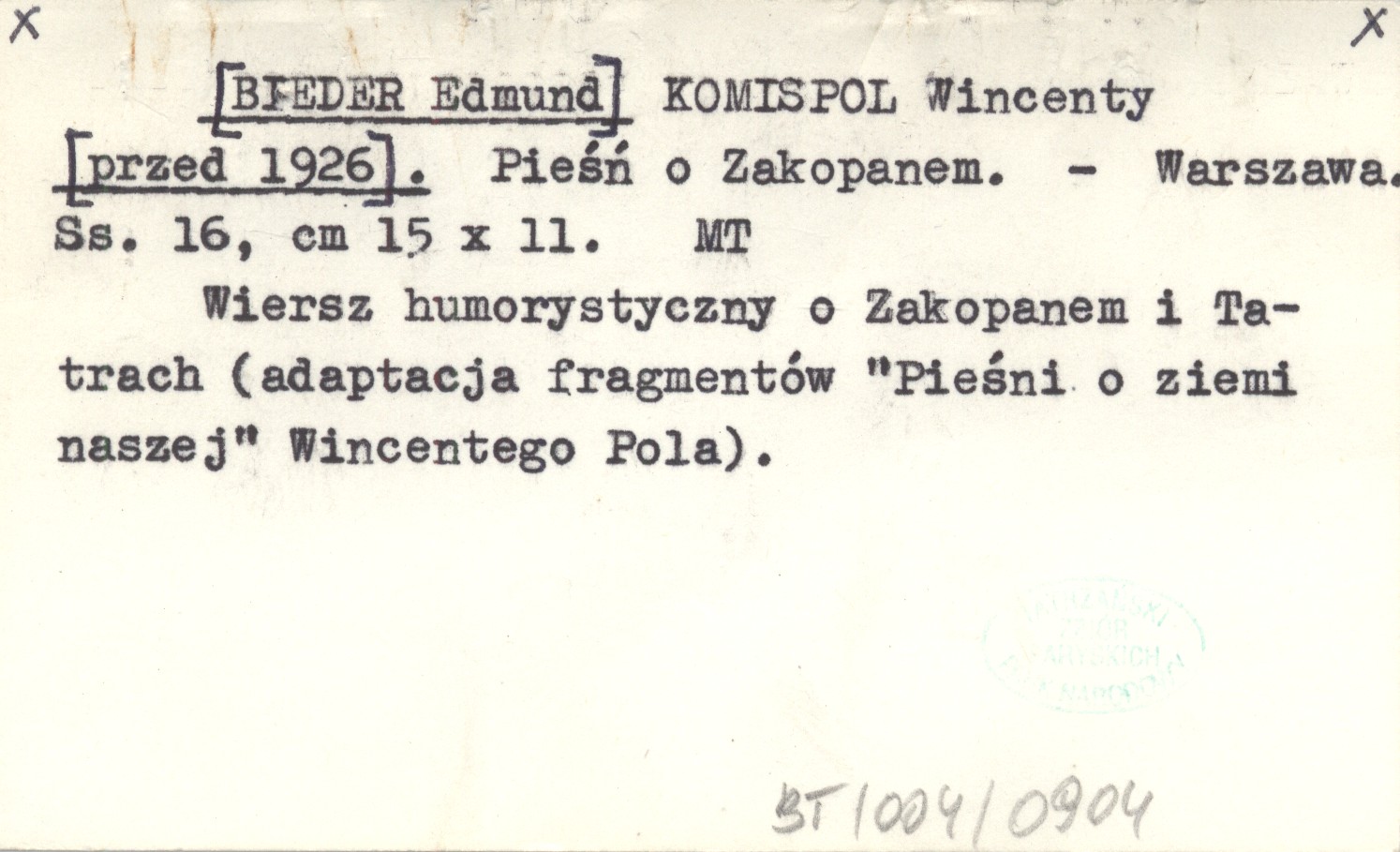 [BIEDER Edmund] KOMISPOL, Wincenty. ; przed 1926 Pieśń o Zakopanem.