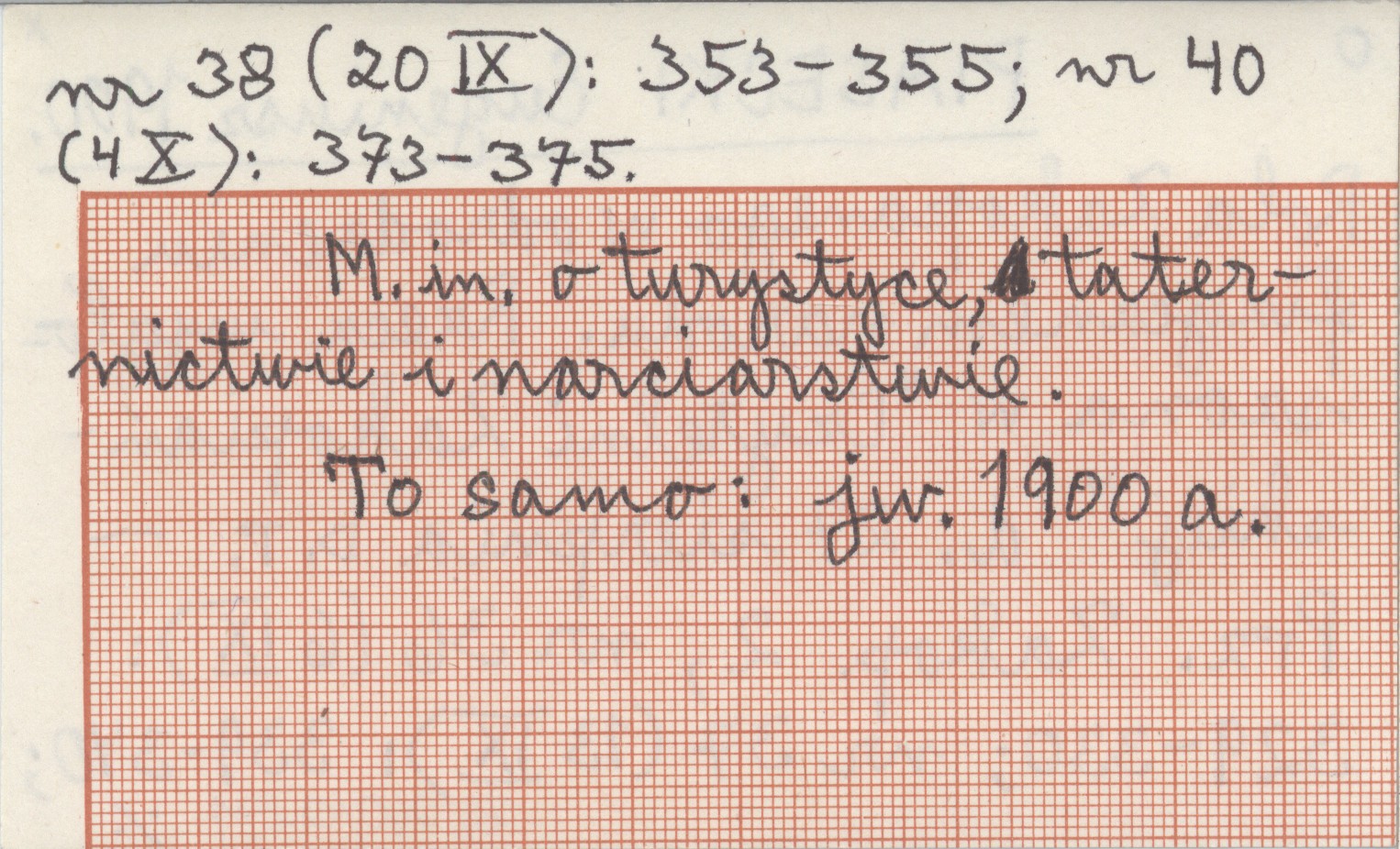 Przegląd Zakopiański, 2, nr 36 (6 IX): 329-330 ; nr 37 (13 IX): 339-340 ; nr 38 (20 IX): 353-355 ; nr 40 (4 X): 373-375. M. in. o turystyce, taternictwie i narciarstwie. To samo: jw. 1900 a