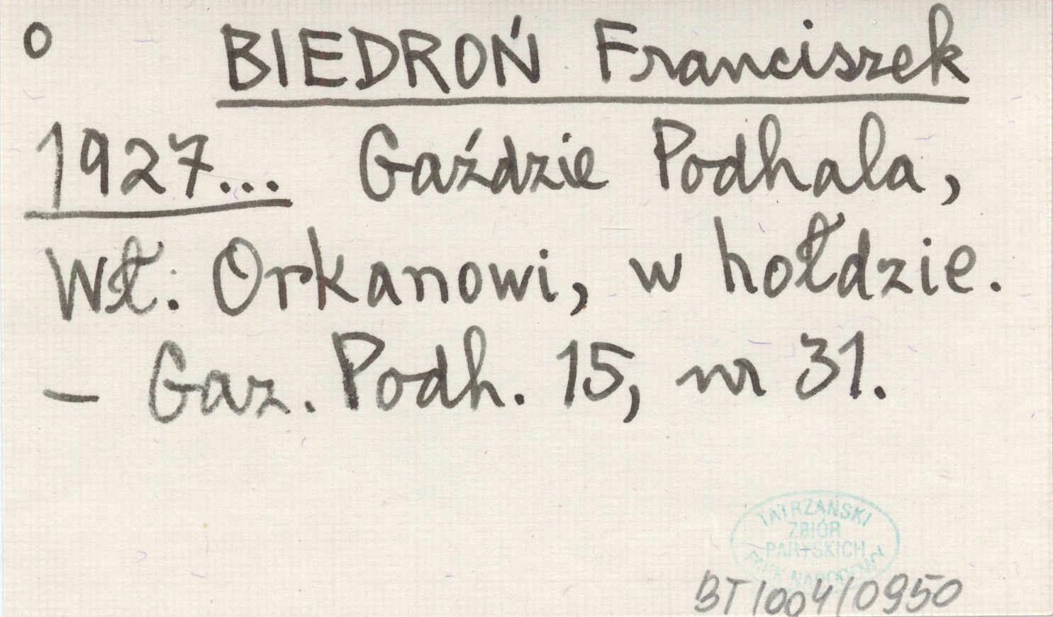 BIEDROŃ Franciszek 1927... Gaździe Podhala, Wł. Orkanowi, w hołdzie.