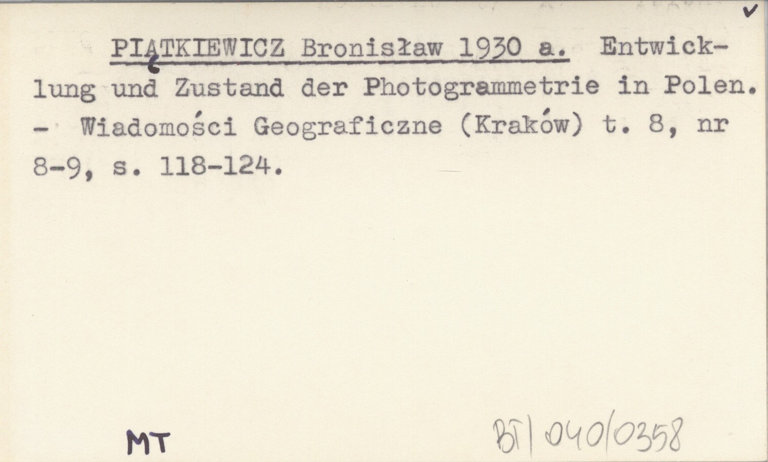 PIĄTKIEWICZ Bronisław 1930 a Entwicklung und Zustand der Photogrammetrie in Polen.