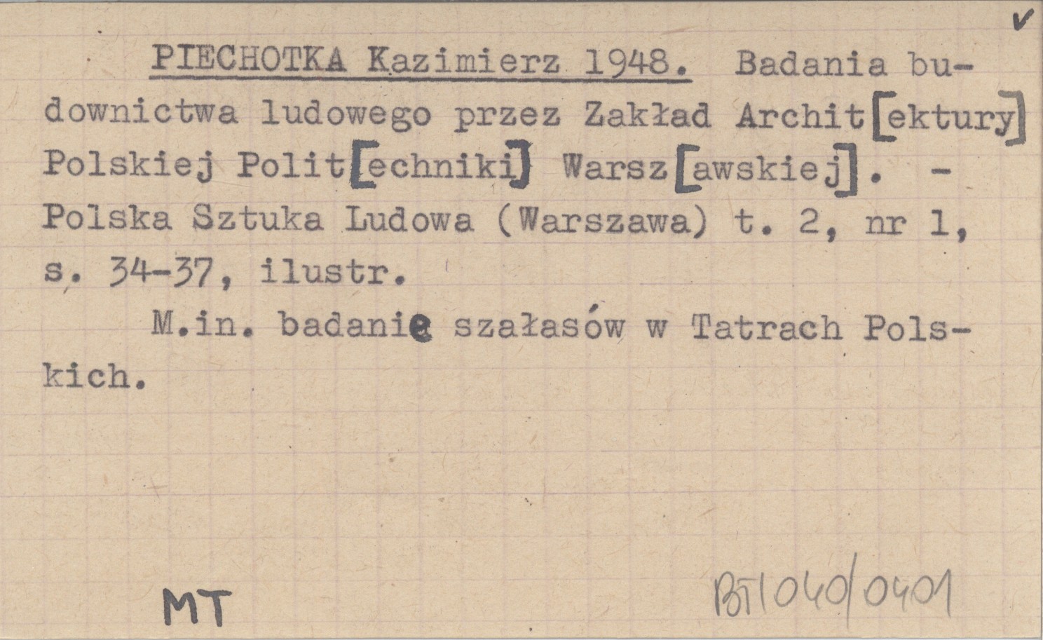 PIECHOTKA Kazimierz 1948 Badania budownictwa ludowego przez Zakład Archit[ektury] Polskiej Polit[echniki] Warsz[awskiej].