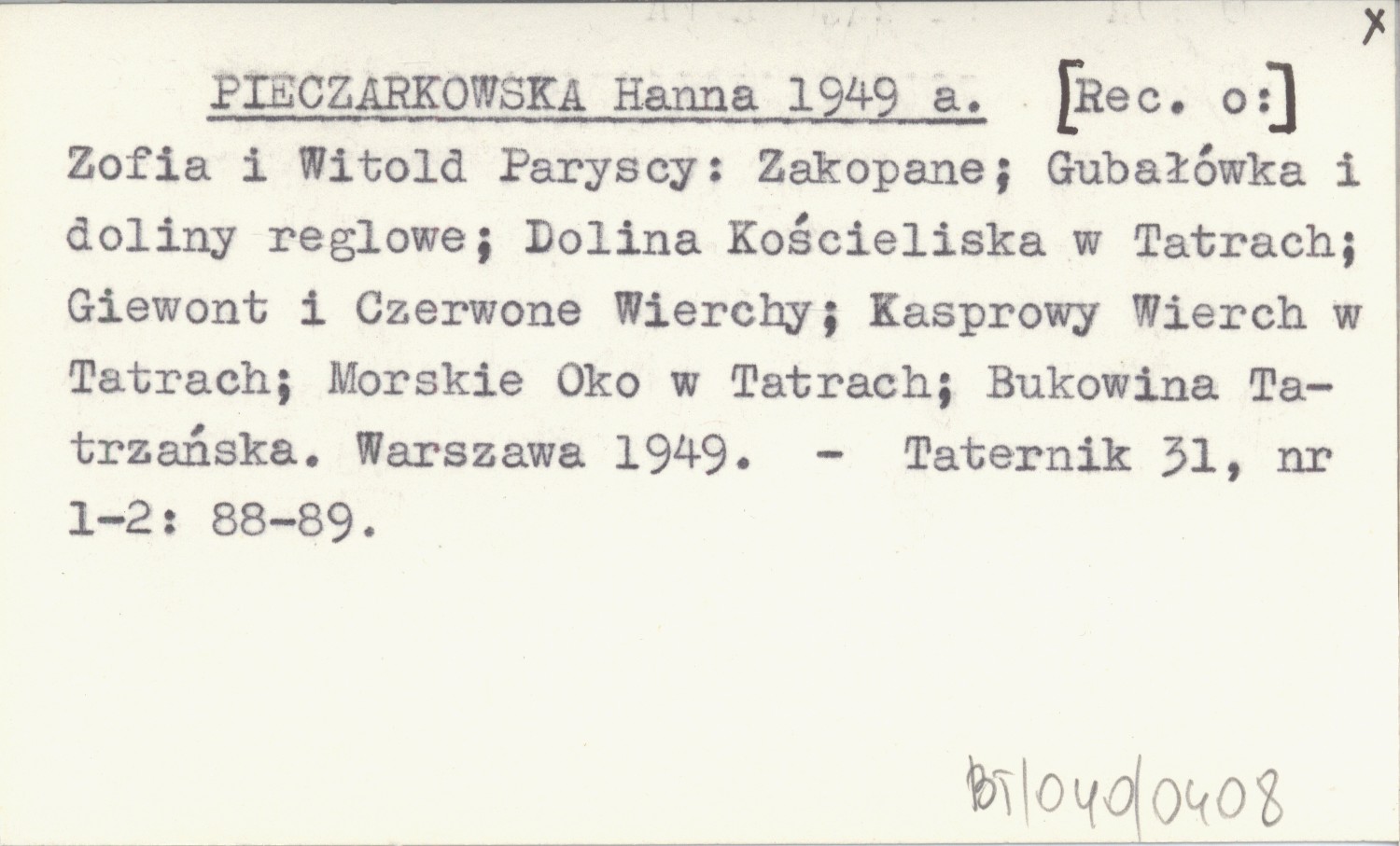 PIECZARKOWSKA Hanna 1949 a [Rec. o:] Zofia i Witold Paryscy: Zakopane ; Gubałówka i doliny reglowe ; Dolina Kościeliska w Tatrach ; Giewont i Czerwone Wierchy ; Kasprowy Wierch w Tatrach ; Morskie Oko w Tatrach ; Bukowina Tatrzańska. Warszawa 1949.