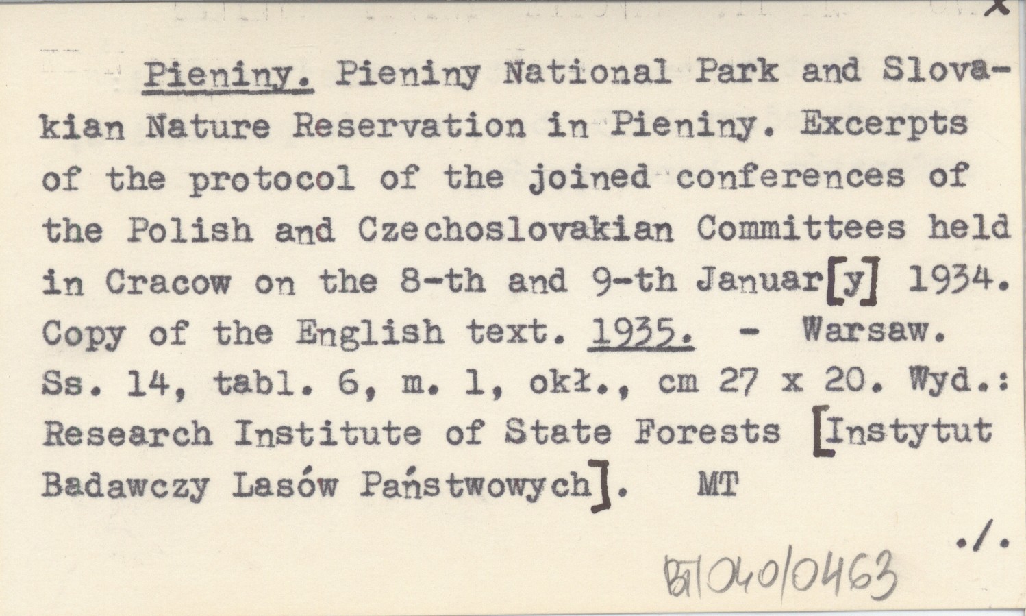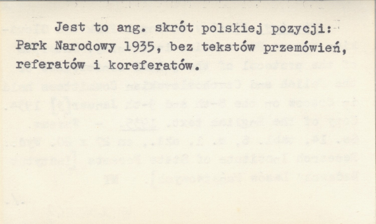 Research Institute of State Forests [Instytut Badawczy Lasów Państwowych], Warsaw , 14 s., 6 k., 1 mapa, okł., 27x20 cm. Jest to angielski skrót polskiej pozycji: Park Narodowy 1935, bez tekstów przemówień, referatów i koreferatów.