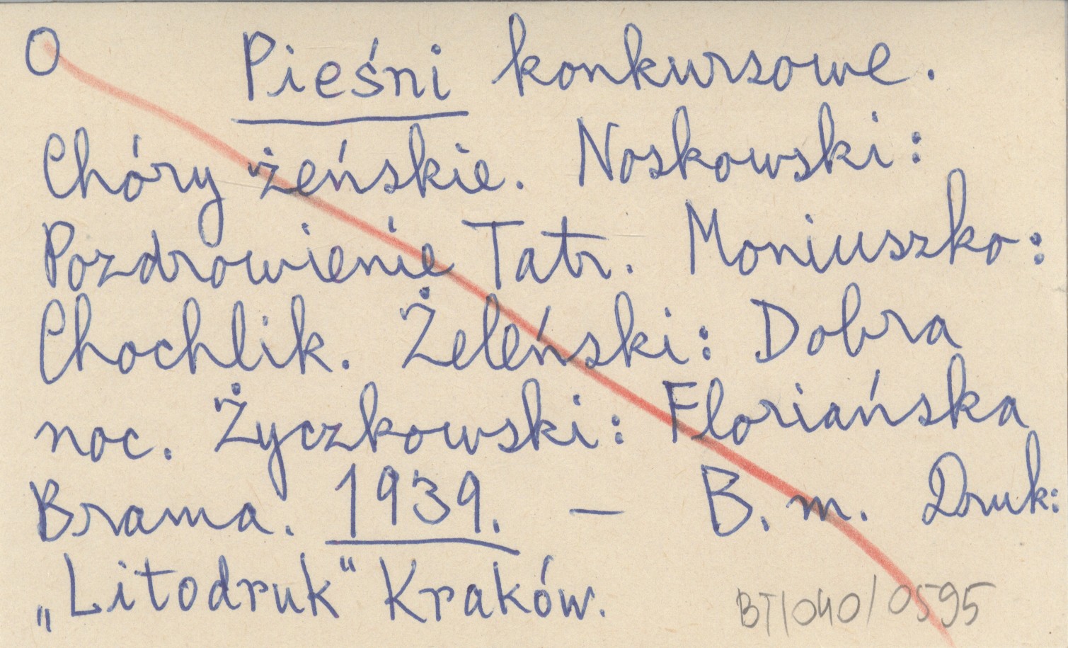 Pieśni konkursowe. Chóry żeńskie. Noskowski: Pozdrowienie z Tatr. Moniuszko: Chochlik. Żeleński: Dobra noc. Życzkowski: Floriańska Brama. 1939