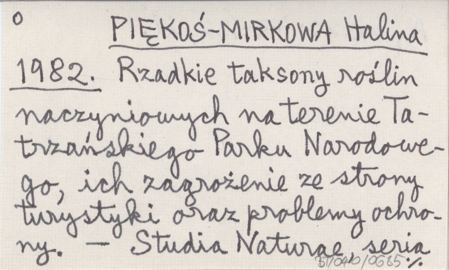 PIĘKOŚ-MIRKOWA Halina 1982 Rzadkie taksony roślin naczyniowych na terenie Tatrzańskiego Parku Narodowego, ich zagrożenie ze strony turystyki oraz problemy ochrony.