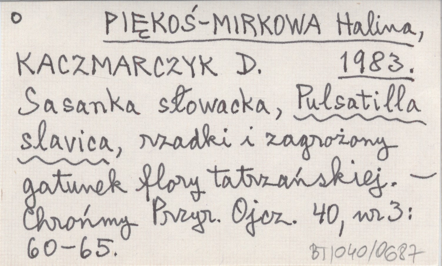 PIĘKOŚ-MIRKOWA Halina KACZMARCZYK, D. ; 1983 Sasanka słowacka, Pulsatilla slavica, rzadki i zagrożony gatunek flory tatrzańskiej.