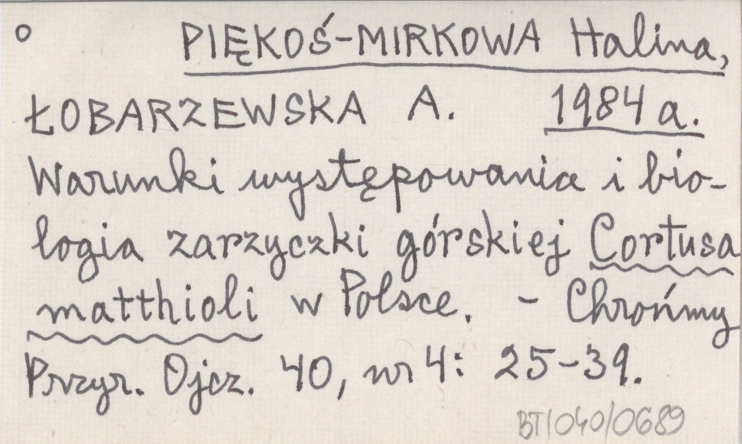 PIĘKOŚ-MIRKOWA Halina ŁOBARZEWSKA, A. ; 1984 a Warunki występowania i biologia zarzyczki górskiej Cortusa matthioli w Polsce.